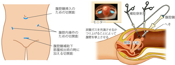 開腹手術と違って傷跡がほとんど残らず、回復が早いため早期に退院でき、術後の癒着が少ない、出血量が少ないなどの長所があります。